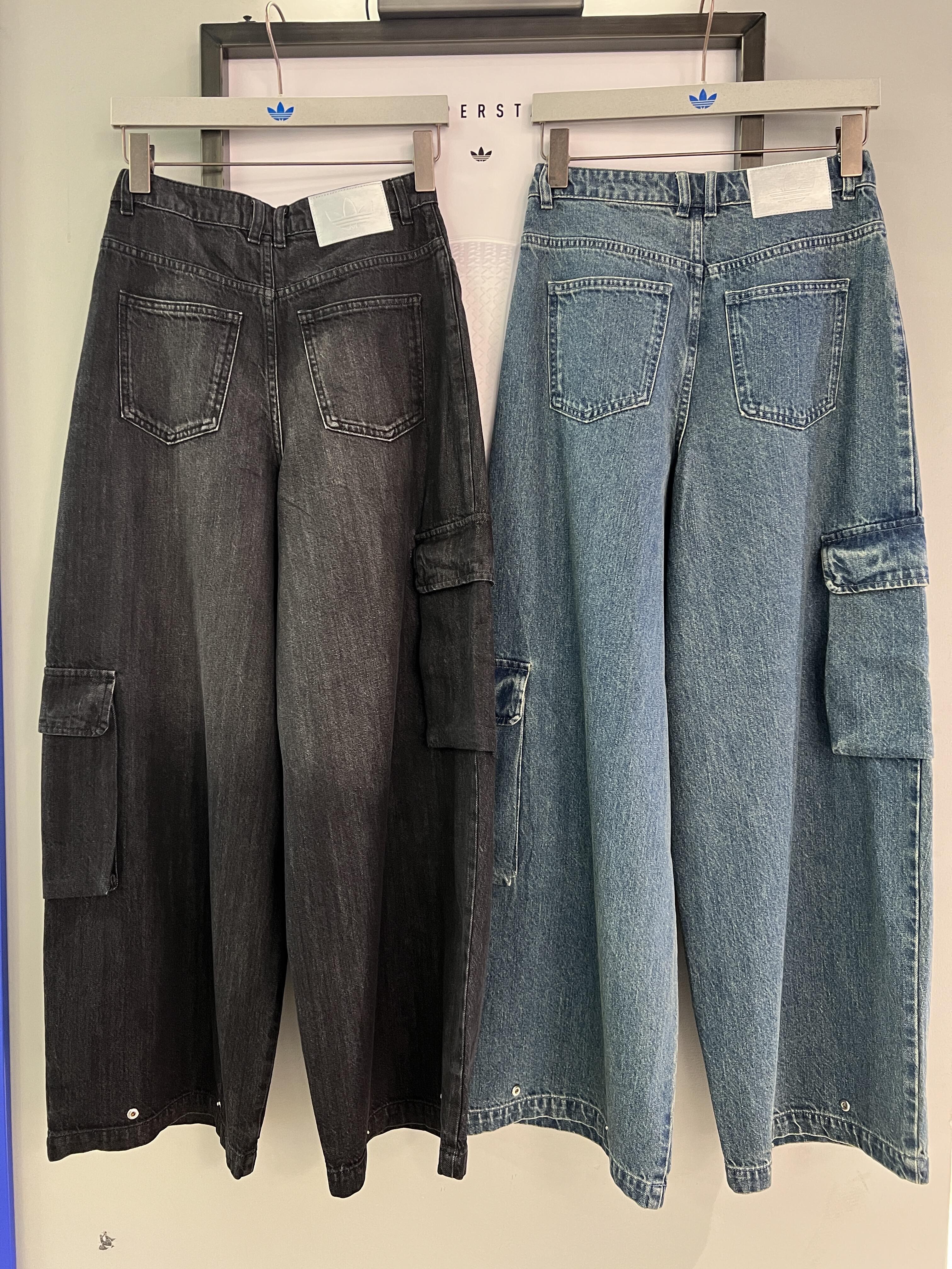 有很多口袋的寬鬆版型丹寧工裝長褲
